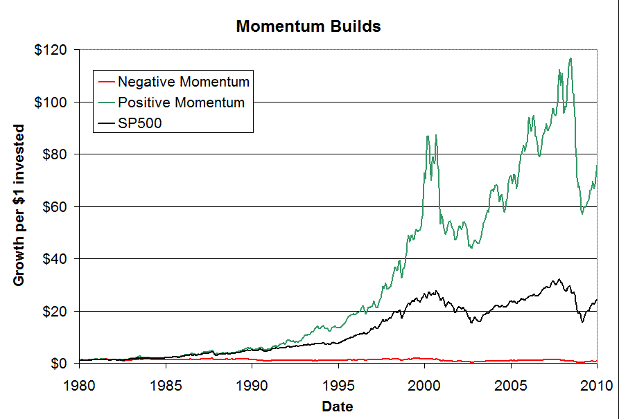 Momentum investing: A truly wild ride What is momentum investing? At its simplest, momentum investing means picking stocks based on how well they have fared over the past year compared to the average. The stocks that have risen the most are good positive momentum candidates. If that sounds suspiciously like technical analysis to you, you're right. It is. Yet this approach has been working well for a very long time. Famed investor James O'Shaughnessy examined the return pattern of portfolios containing the 50 best (and worst) performing large U.S. stocks each year in his book What Works on Wall Street. From 1951 to 2003, he found that the positive momentum group gained an average of 14.73% annually versus the market, which returned 11.71% per year. Stocks with negative momentum trailed with average gains of only 9.11% a year over the same period. What time period should you use? You may be wondering if using a one-year time frame is special. Maybe buying based on a stock's performance over the past six months or two years would be better? Indeed, these questions have inspired a host of research. The result? Some time periods do seem to be better than others for some investors. One strategy is to buy a new momentum portfolio each month, hold it for a month, and then replace it. (It's not quite day trading but it's getting there.) And rather than measuring each stock's momentum over the past year, you only look at the period ranging from 12 months to two months prior to the stock's purchase date. In short, you ignore the performance during the past two months. How do momentum stocks perform? Looking over the whole period from 1980 to 2010, the positive momentum portfolio has been a big winner. It provided average returns of 15.5% a year over 30 years. At the same time, the S&P 500 advanced 11.2%, meaning that the momentum strategy delivered a whopping 4.3 percentage point boost, on average, each year. [larger version] You should keep in mind, however, that these annual returns do not include fees, such as trading commissions, nor pricey frictions, such as bid-ask spreads. Given the frequent trading involved, those costs can really add up - in some cases to the point where this strategy could be unprofitable in practice. That's why many traders are keen to opt for longer holding periods. For small investors, who face substantial trading frictions and commissions, rebalancing once a year is more practical due to the lower costs involved. With this in mind, we've put together a list of 10 stocks that exhibit strong positive momentum. We're opting for the less frantic O'Shaughnessy approach which means that you can hold the selected stocks for one year based on returns over the past year. Because his results are based on large stocks, we'll stick to firms in the S&P 500. Our picks are shown in Top momentum stocks below. What can go wrong? Momentum portfolios tend to be highly volatile and a small 10-stock portfolio will likely accentuate the already large swings. If you're keen on pursuing such a high volatility strategy, you'll need an iron stomach and you might want to do it with only a small portion of your portfolio. One also needs a rather extraordinary level of faith that such a simple approach will continue to work, and you'll be sorely tested in downturns. It can be very easy to give up on momentum at exactly the wrong time. Make no mistake, momentum isn't for everyone. Top momentum stocks These 10 stocks had the largest price gain of all the stocks in the S&P 500 over the past year. Such stocks tend to keep surging for a while, so betting on the latest rising stars can pay off over time.